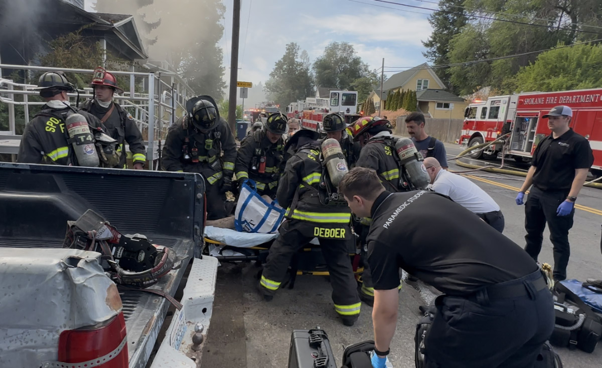 Firefighters quickly began a search of the structure while simultaneously attacking the flames and found an unconscious adult male on the first floor. Firefighters quickly cut the sill from a window on the first floor, removed the fire victim less than four minutes after arrival, and upgraded the incident to a second alarm. The victim was transported to Sacred Heart Medical Center in critical condition.