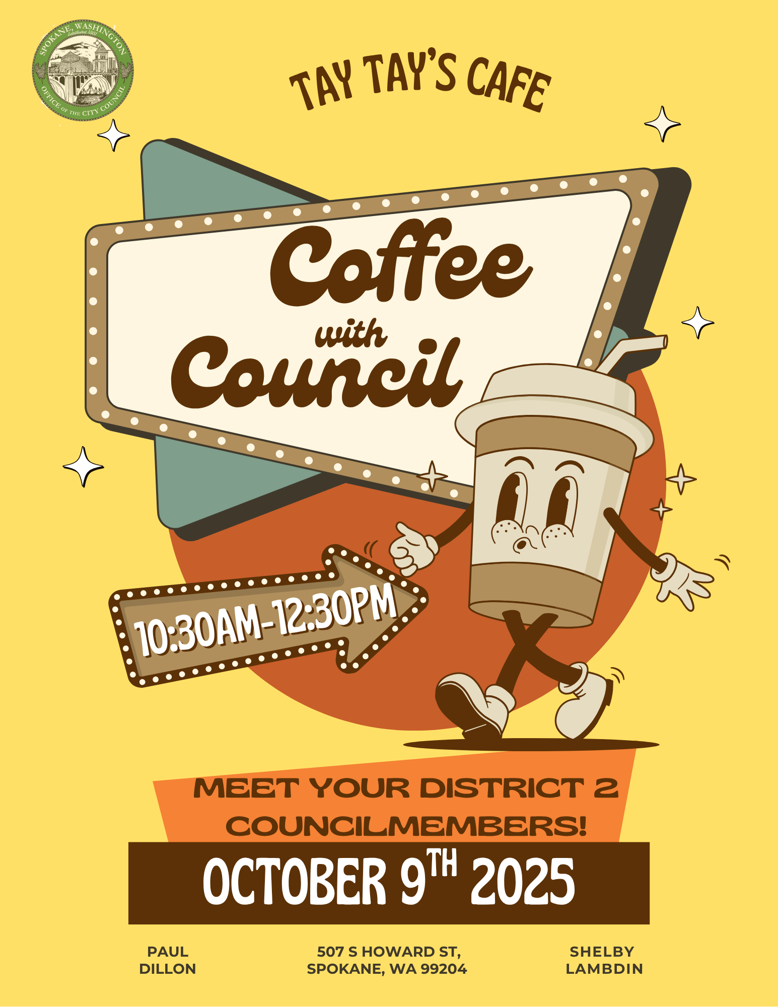 WHAT: Spokane City Council District 2 members will host a “Coffee with Council” event on Thursday, October 9, from 10:30 a.m. to 12:30 p.m. Come and meet Council Members Paul Dillon and Shelby Lambdin, who both represent the southern part of Spokane. This event offers a great chance for residents to share ideas, discuss issues, and get to know their elected officials.