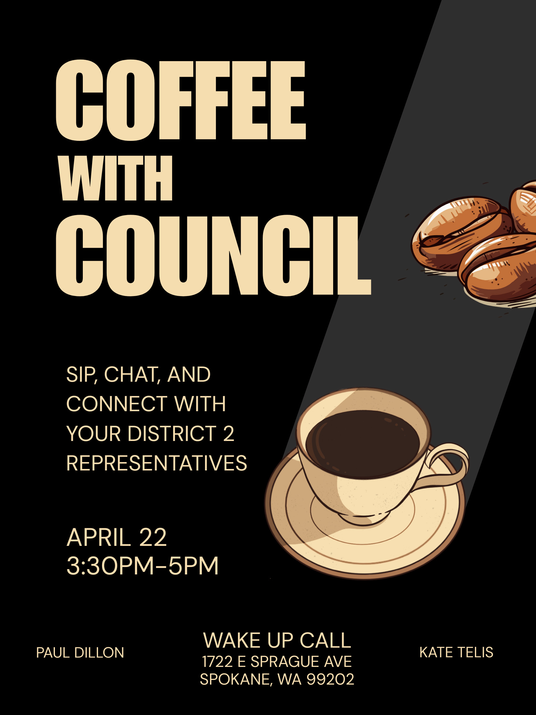 The Spokane City Council District 2 members will host a “Coffee with Council” event on Wednesday, April 22, from 3:30 p.m. to 5 p.m. Come and meet Council Members Paul Dillon and Kate Telis, who both represent the southern part of Spokane. This event offers a great chance for residents to share ideas, discuss issues, and get to know their district officials.