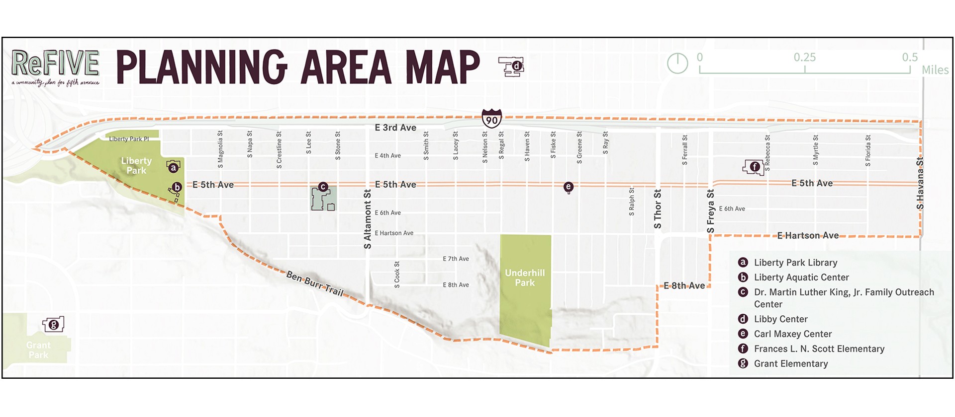 The study area is located south of I-90 around the 5th Avenue corridor, in the southeast section of the East Central neighborhood. This area includes the historical Black business district and is home to several diverse community organizations that serve both local residents and regional visitor. Key community-based organizations include the Carl Maxey Center, Martin Luther King Jr. Family Outreach Center, Spokane Eastside Reunion Association and Fresh Soul Restaurant, and New Developed Nations among other businesses along 5th Avenue. Key destinations include Liberty Park and Underhill Park, Liberty Park Aquatic Center, Liberty Park Public Library, and the Frances L.N. Scott Elementary School, named for the Spokane civil rights leader, educator, and lawyer who grew up in the neighborhood.