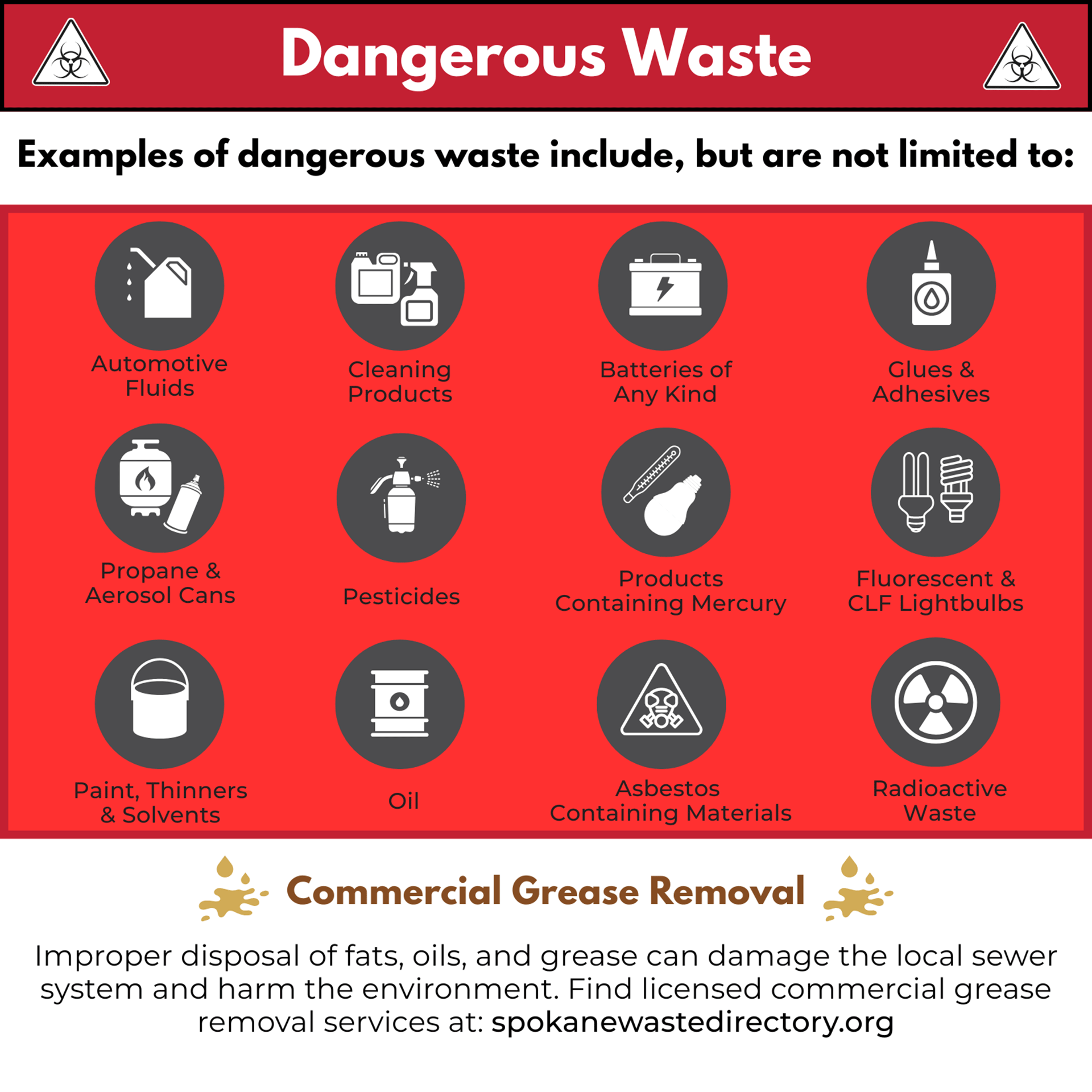 Businesses that generate hazardous or dangerous waste, are required to manage and dispose of it properly. For detailed guidance, visit: ecology.wa.gov.